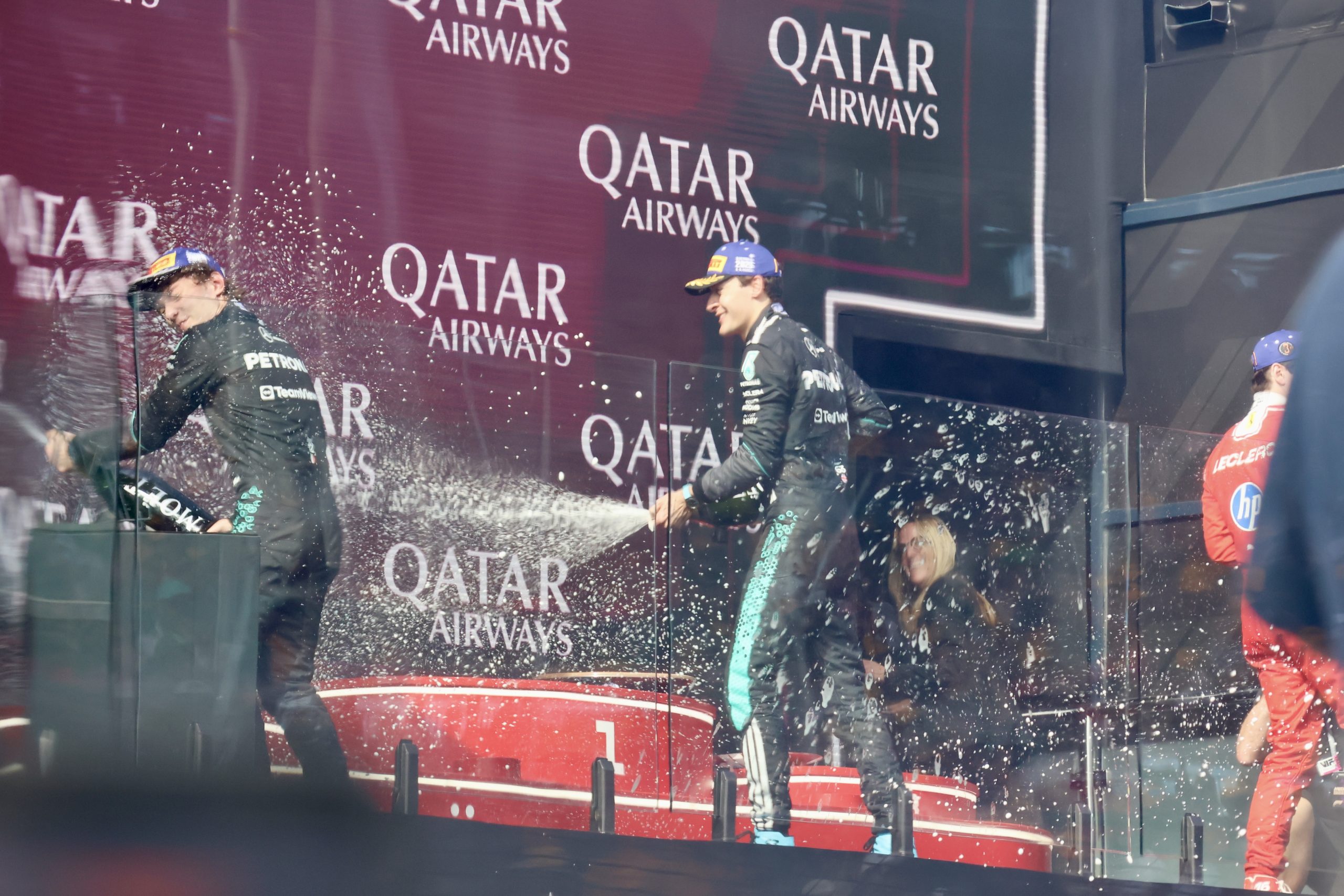 Leclerc launched from fourth and was through into Turn 1 in front. Antonelli, from the front row, tumbled back to seventh in the scramble. Russell, on pole, found himself in second.